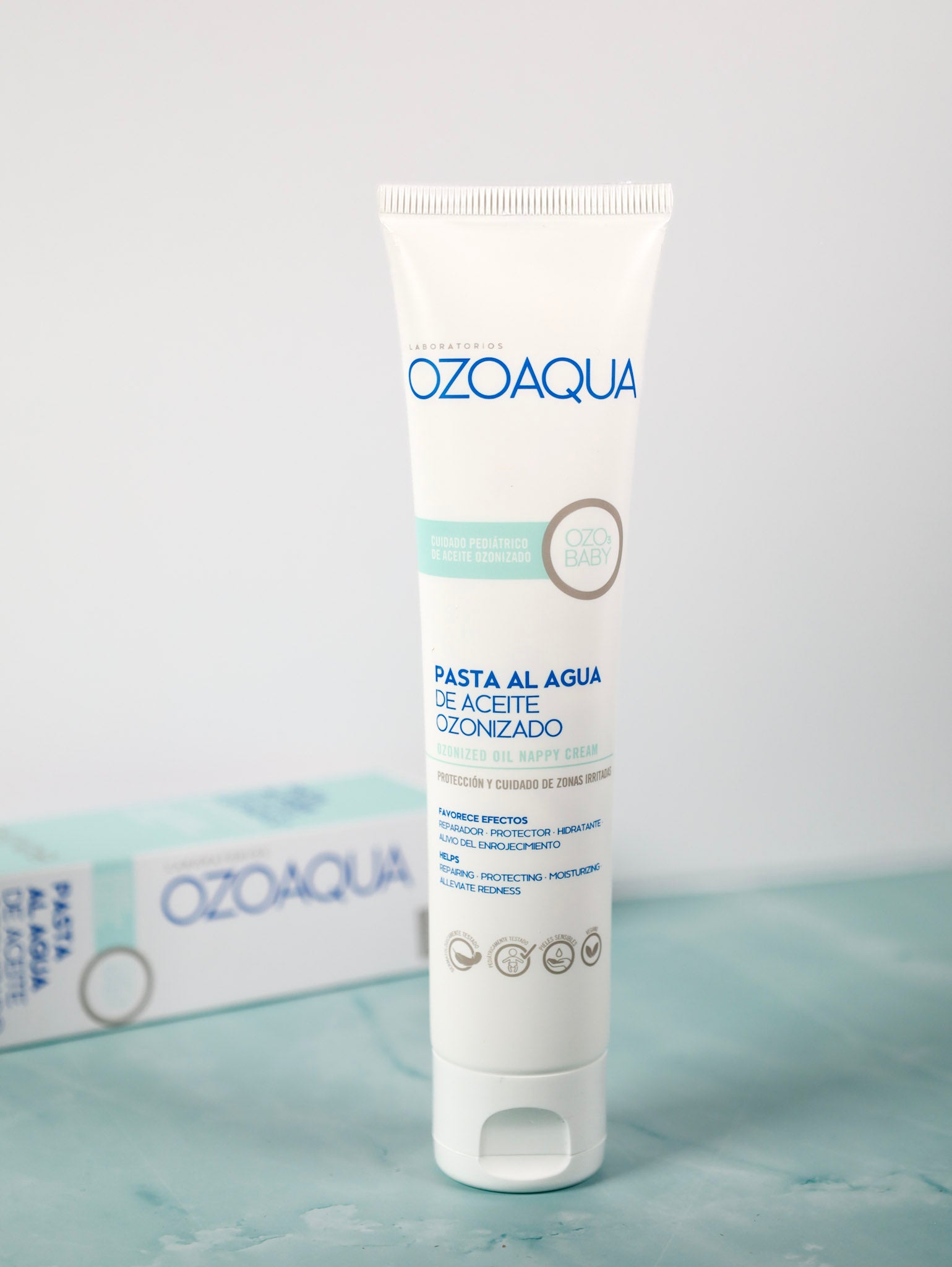 La Pasta al agua de Aceite ozonizado OzoBaby está especialmente formulada para la protección, cuidado y prevención de irritaciones y complicaciones en la zona del pañal, proporcionando una sensación de alivio y confort inmediato. Su fórmula innovadora a base de Aceites Vegetales Ozonizados combinados con Oxido de Zinc, α-Bisabolol, Pantenol, Manteca de Karité, Vitamina E, Almidón de Arroz y Cera de Carnauba, favorece una acción reparadora, hidratante y antioxidante. Su aplicación crea una barrera de protección que ayuda a restaurar la función barrera y a recuperar el estado fisiológico natural de la delicada piel del bebé, aislándola de factores irritantes como la orina y las heces.